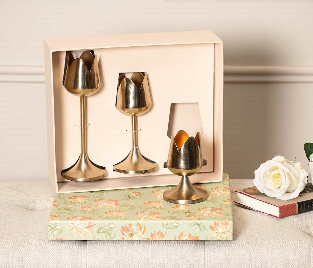Tulip-inspired tea light holder set of three, perfect for festive evenings.