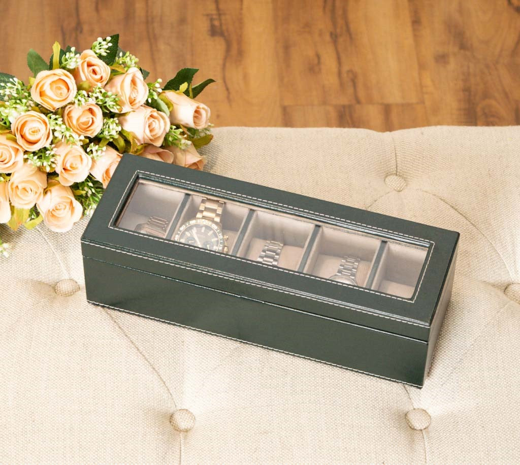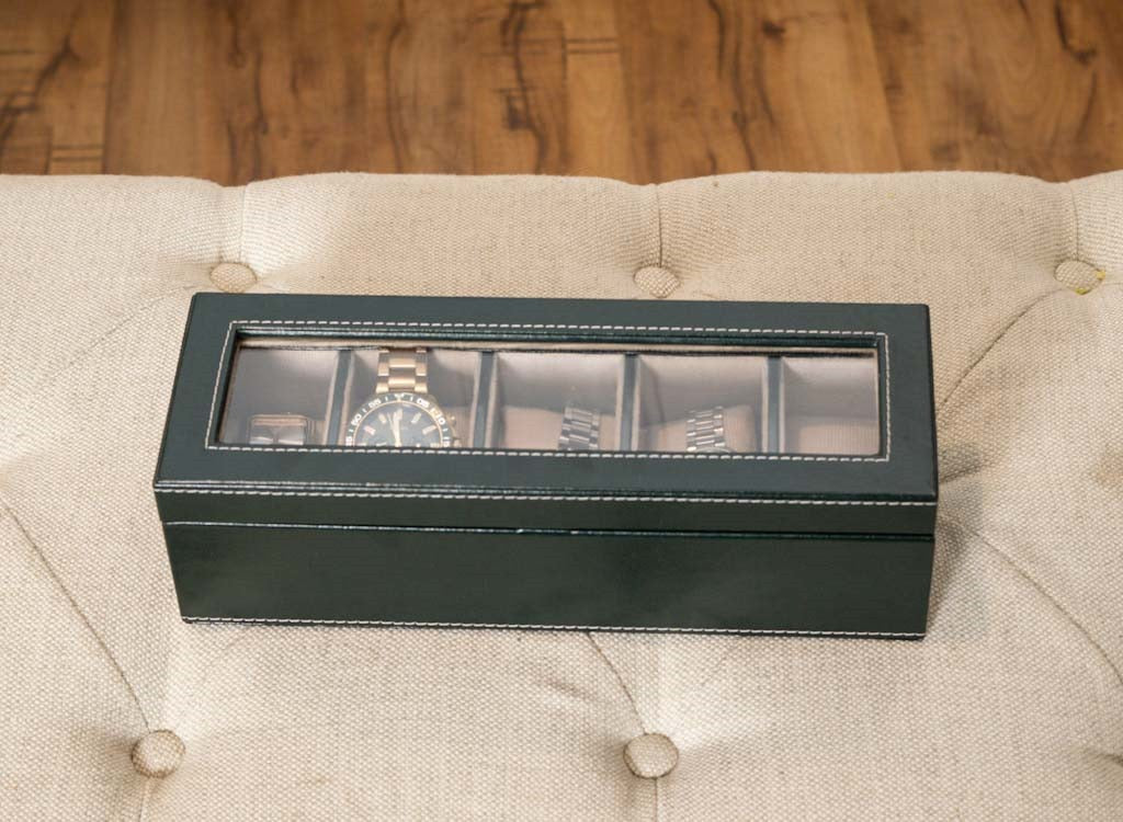 Keep your timepieces safe, scratch-free, and beautifully displayed with this 5-pocket leatherette watch case. Wrapped in smooth, durable faux leather with a soft interior lining, each compartment holds a single watch securely in place, making it ideal for storage or travel. The compact, structured design fits easily on dressers, in drawers, or inside luggage.