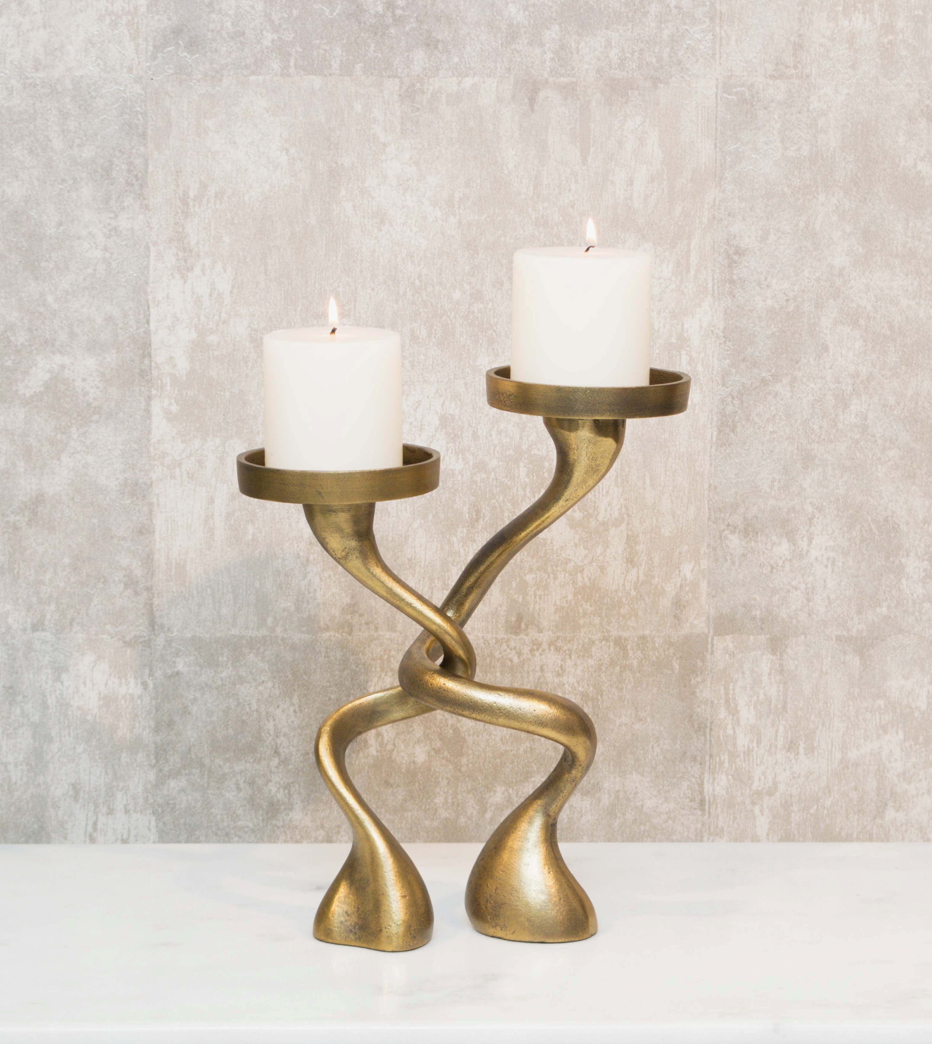 Set of 2 aluminum pillar holders with mingled design in glossy antique or nickel finish.