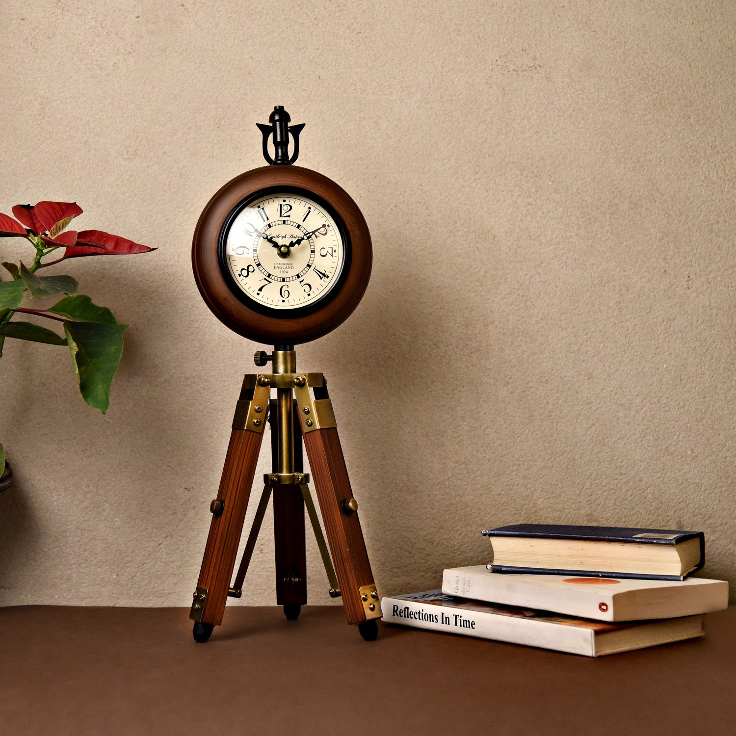 Wooden tripod table clock, vintage-inspired design.